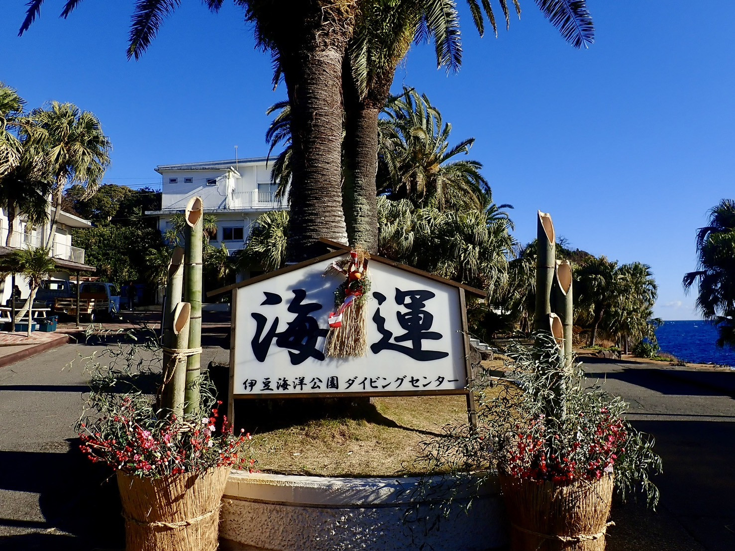 ダイビングセンタースタッフがお正月飾りを運んでいる。「寿」だ。